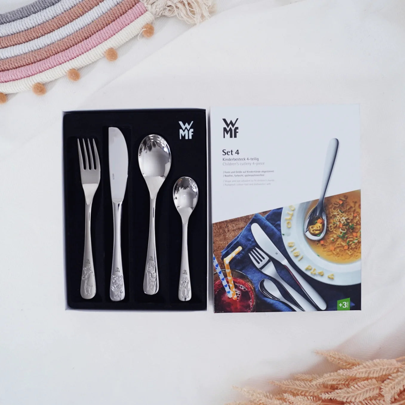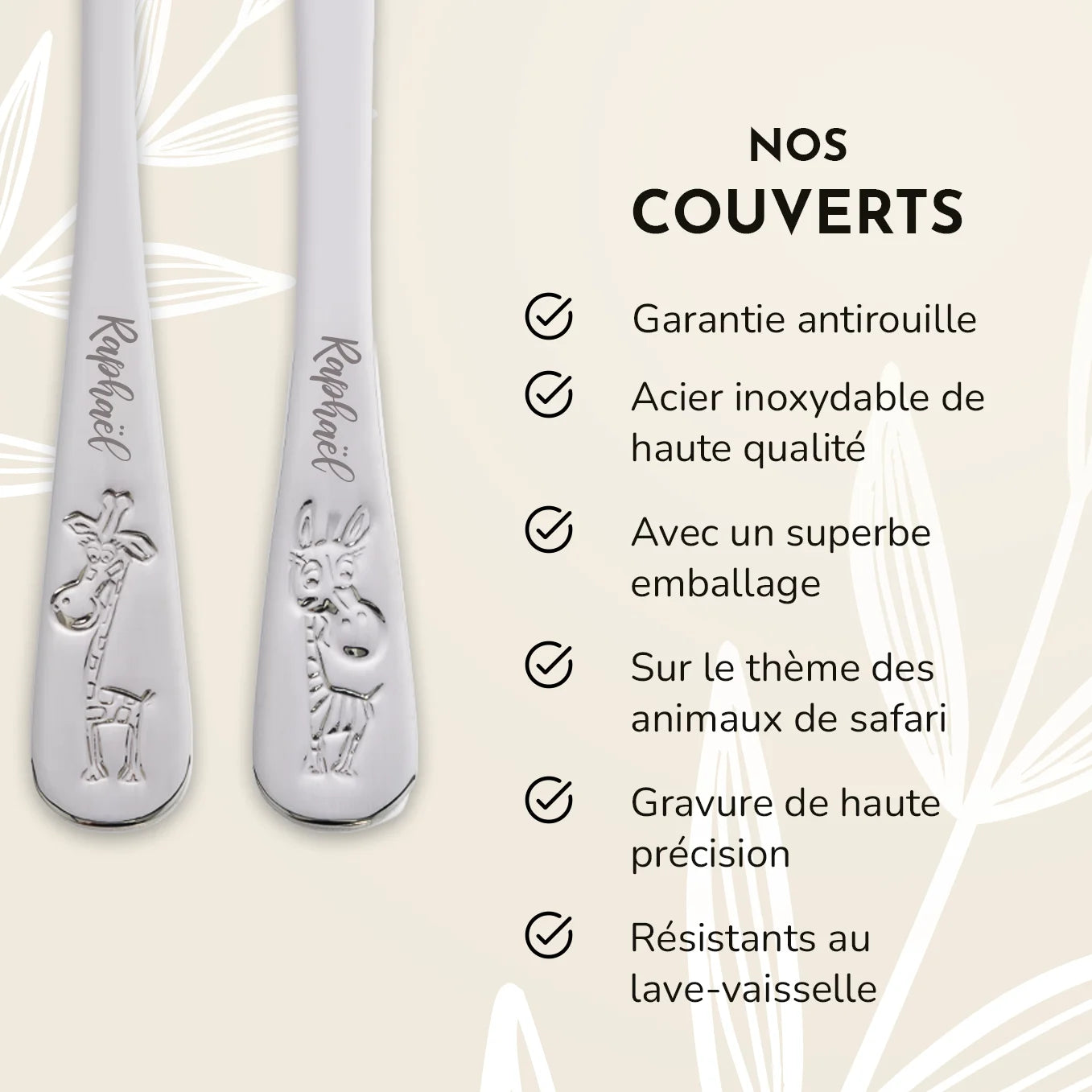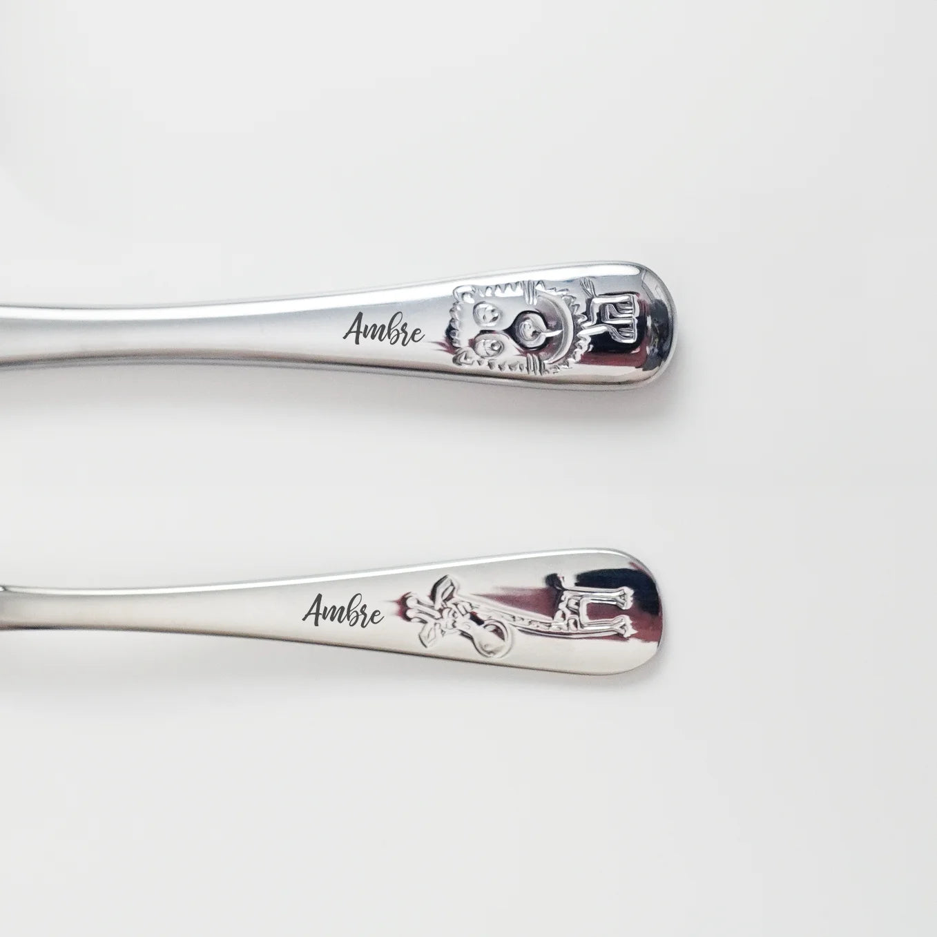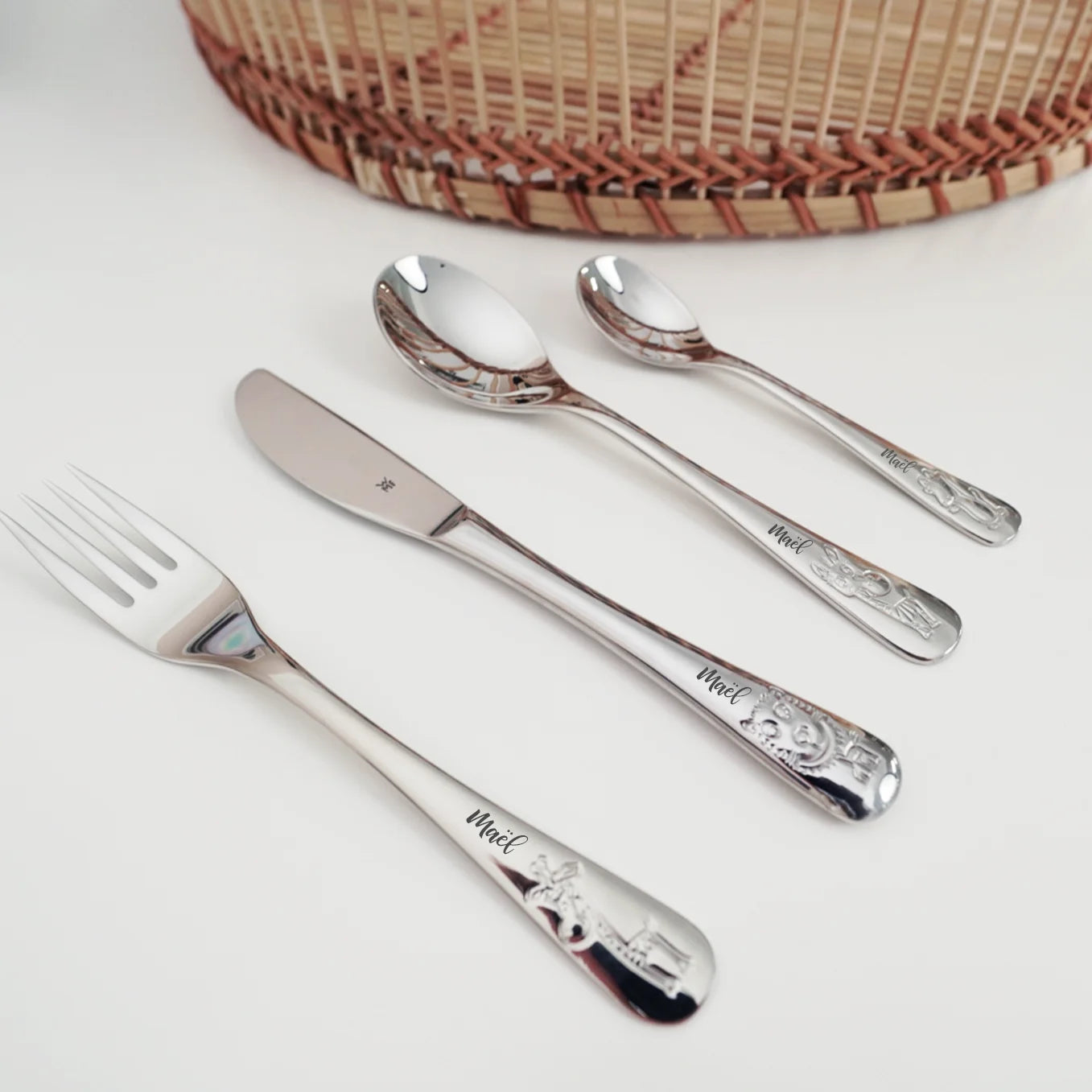 Le set de couverts comprend 2 cuillères, une fourchette et un couteau, tous de haute qualité et gravés au nom de votre enfant.
