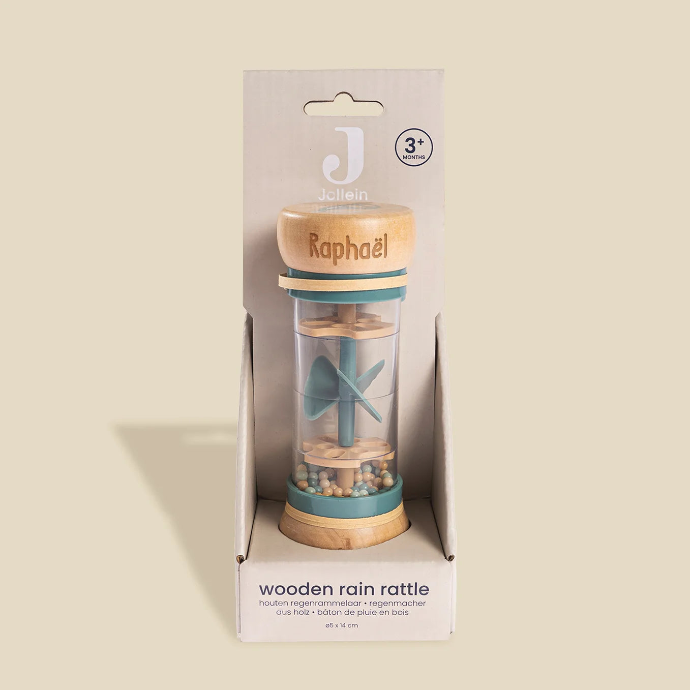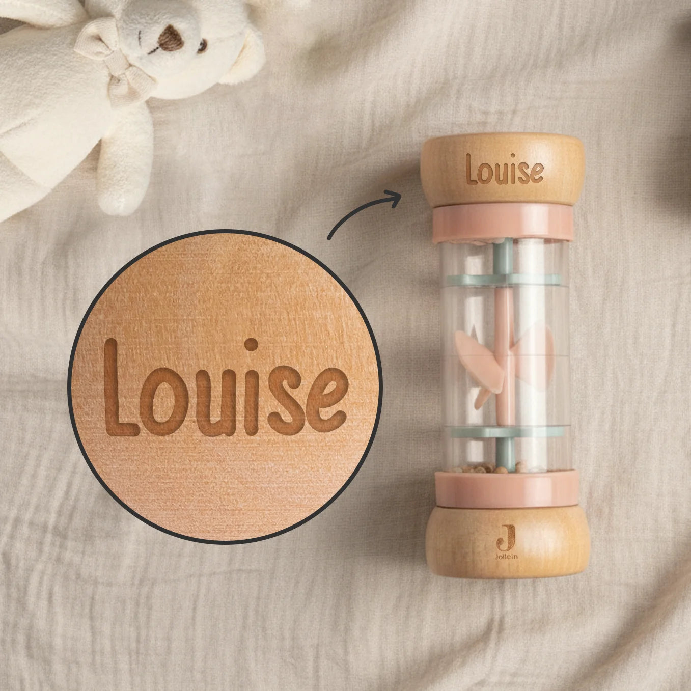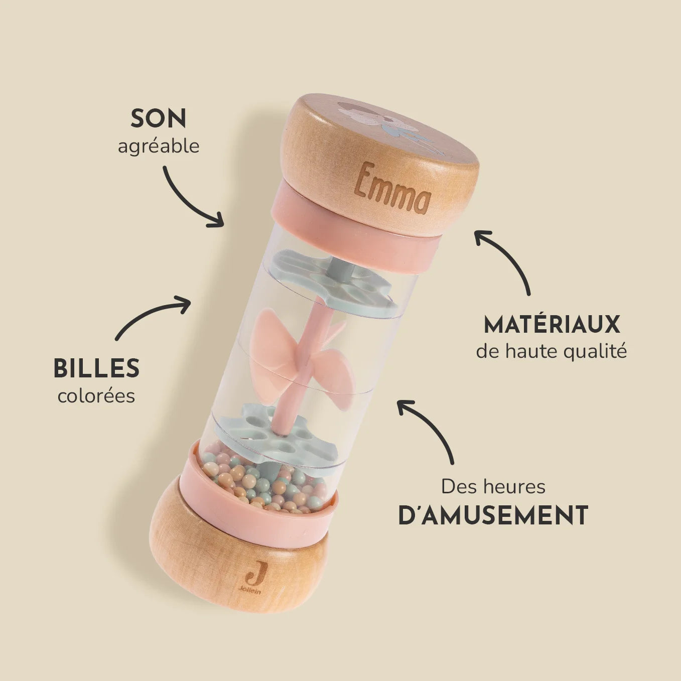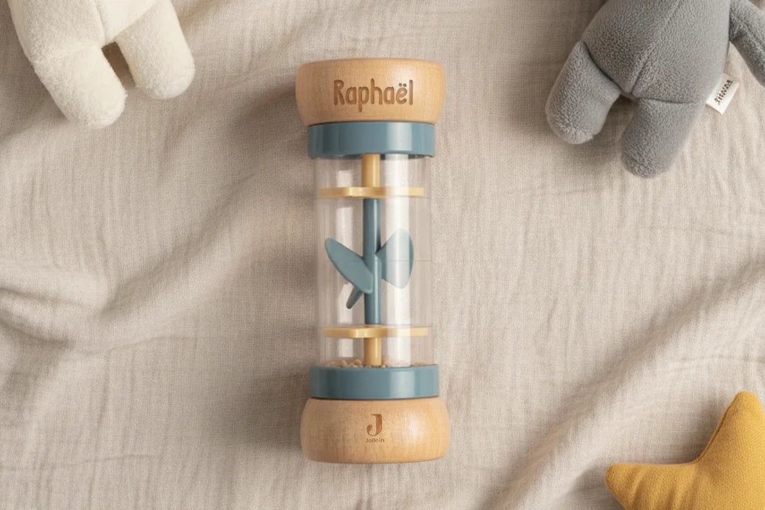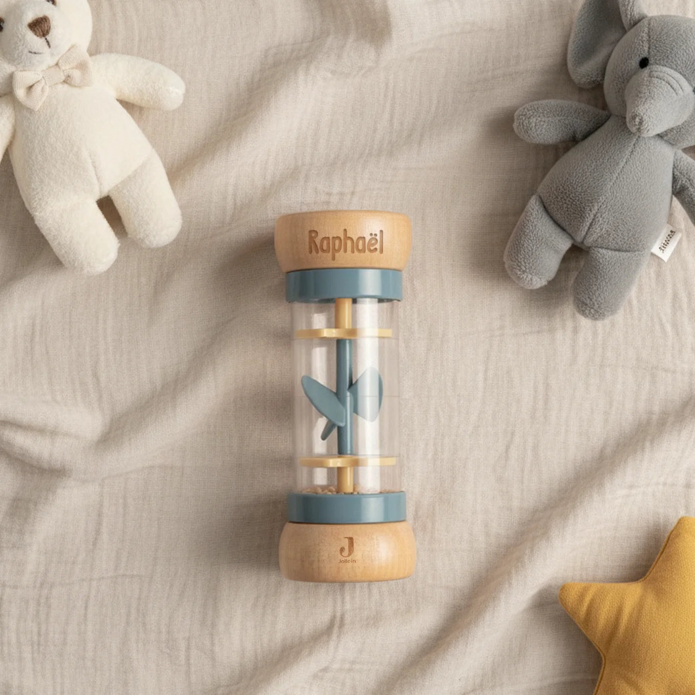 Le hochet est fabriqué en bois certifié FSC et en plastique robuste, le tout sans substances nocives.
