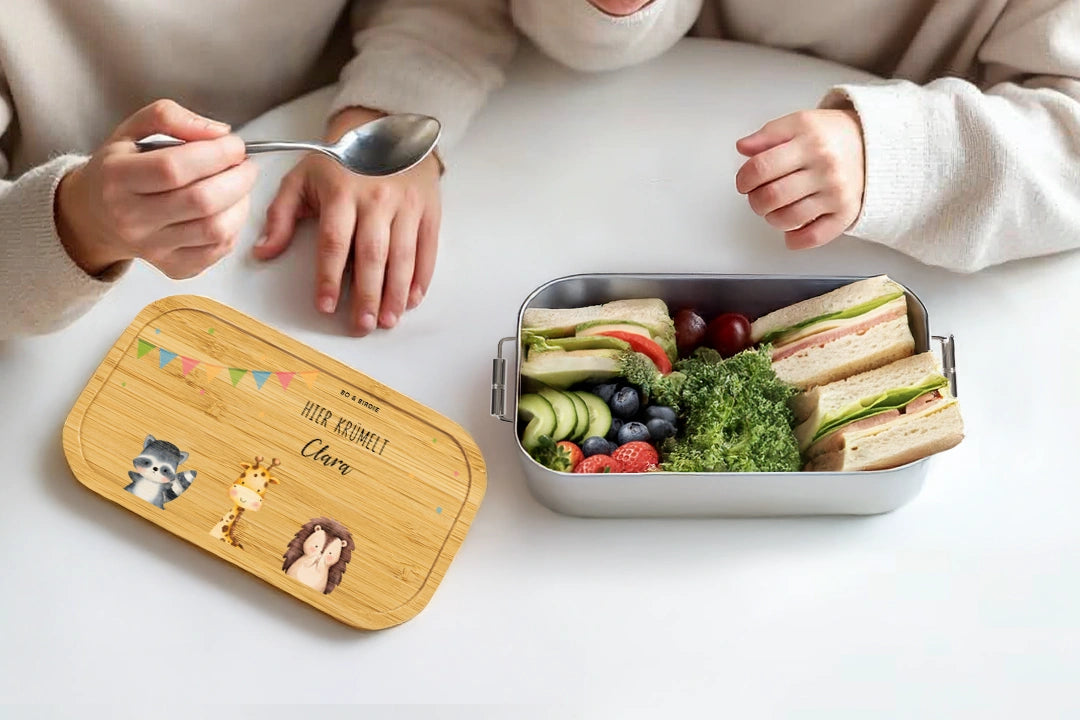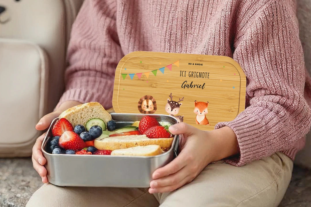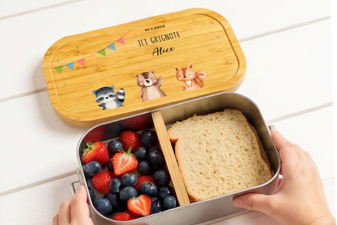 Lunch box durable avec mignons petits animaux et nom – parfaite pour les petits grignoteurs.