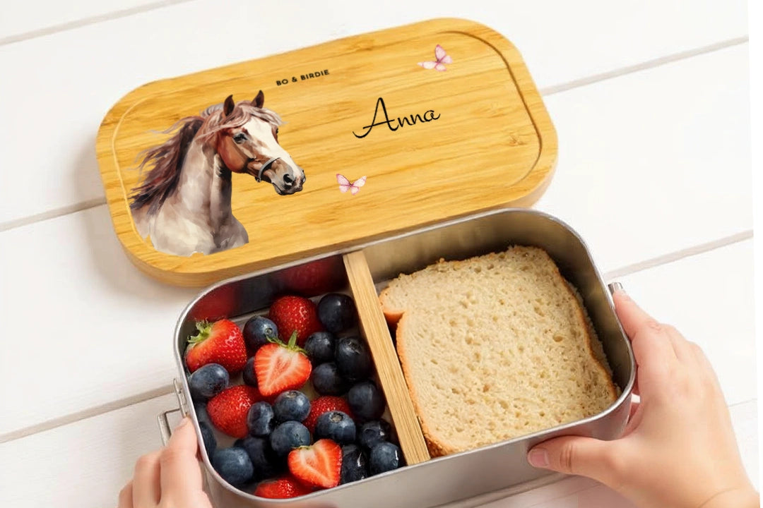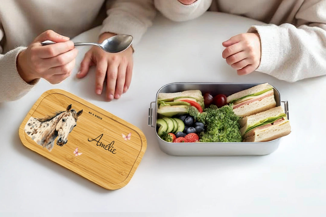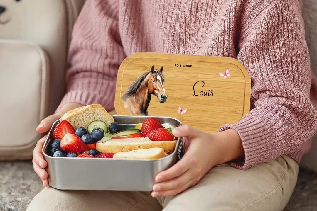 Avec un joli motif de cheval et un nom – parfait pour la maternelle, l'école et les excursions.