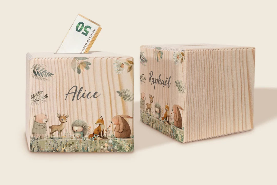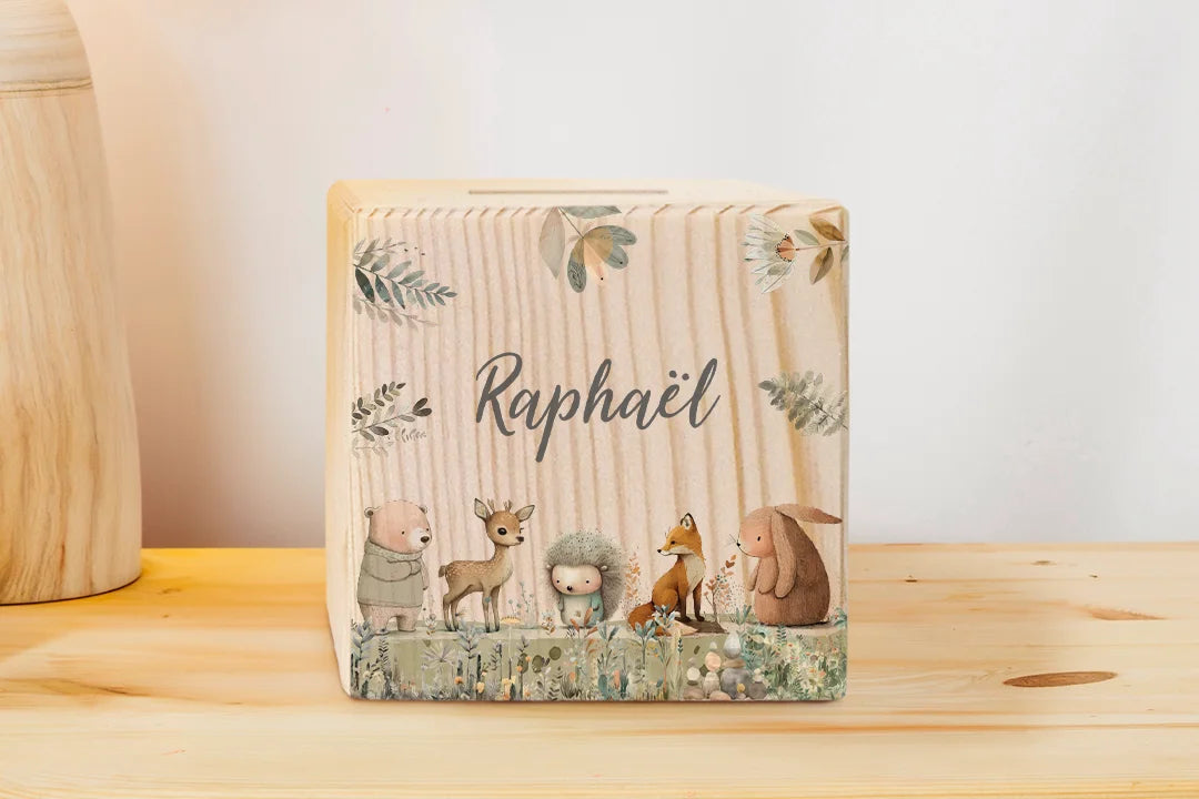 Tirelire en bois personnalisée « Animaux de la forêt aquarelle »